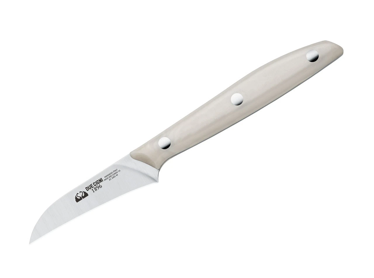 Mit der Serie 1896 stellt Due Cigni eine besonders hochwertige Küchenmesserserie vor, die das Sortiment des Herstellers aus der traditionellen Messerstadt Maniago krönt. Mit Griffen aus widerstandsfähigem weißem POM liegen die Messer ausgezeichnet in der Hand, wobei die klassische Vernietung die optische und haptische Balance perfektioniert. Für die Klingen kommt der bewährte X50CrMoV15 zum Einsatz, der Schnitthaltigkeit und Korrosionresistenz perfekt vereint.