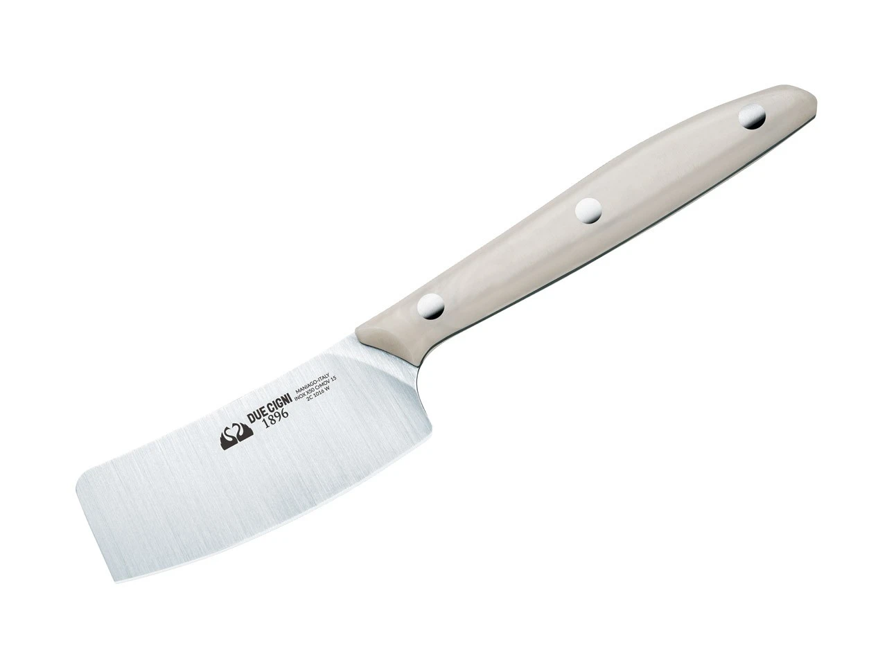 Mit der Serie 1896 stellt Due Cigni eine besonders hochwertige Küchenmesserserie vor, die das Sortiment des Herstellers aus der traditionellen Messerstadt Maniago krönt. Mit Griffen aus widerstandsfähigem weißem POM liegen die Messer ausgezeichnet in der Hand, wobei die klassische Vernietung die optische und haptische Balance perfektioniert. Dieses Käsemesser eignet sich vor allem für das Schneiden von Weichkäse. Für die Klinge kommt der bewährte X50CrMoV15 zum Einsatz, der Schnitthaltigkeit und Korrosionresistenz perfekt vereint.