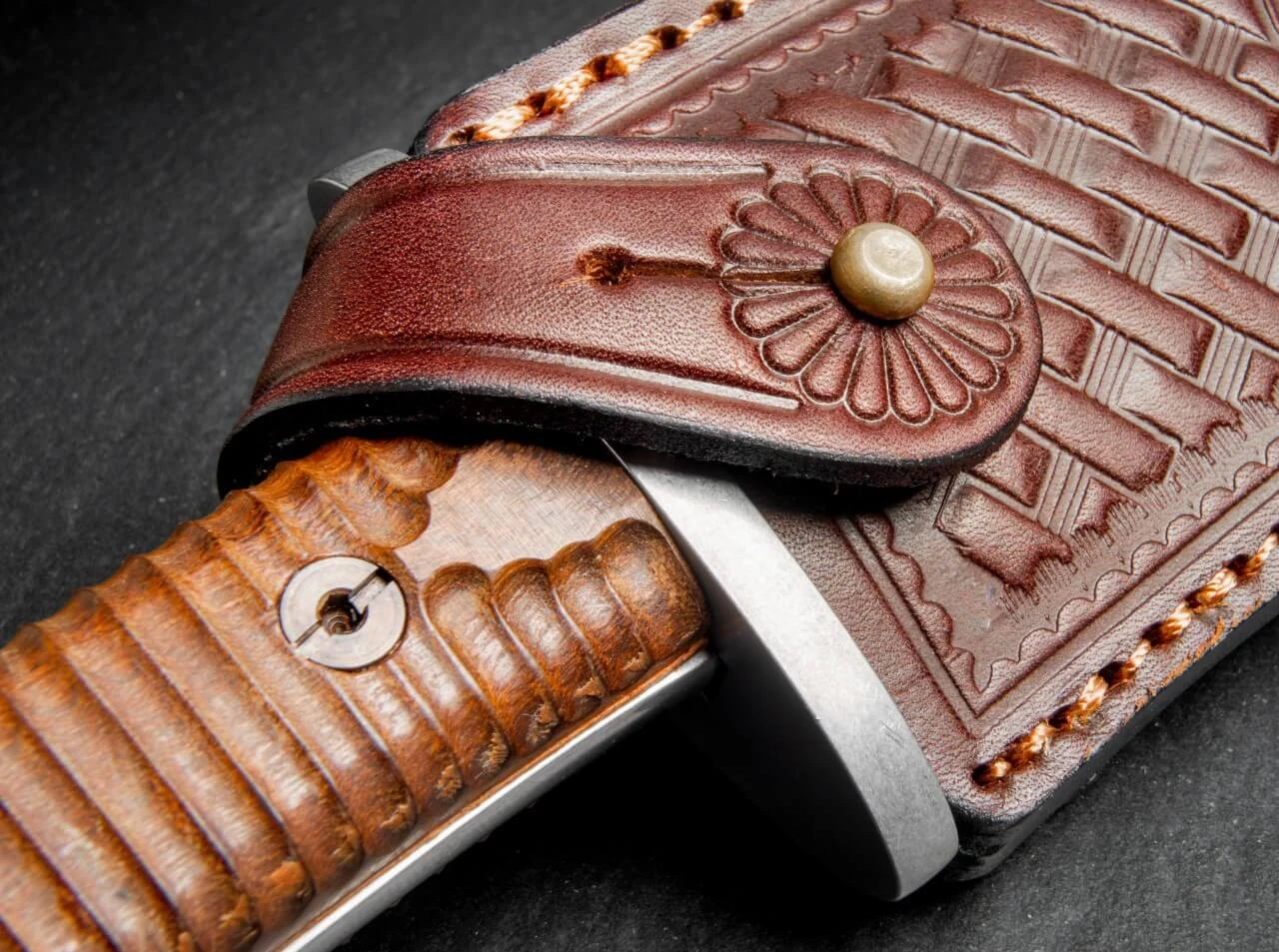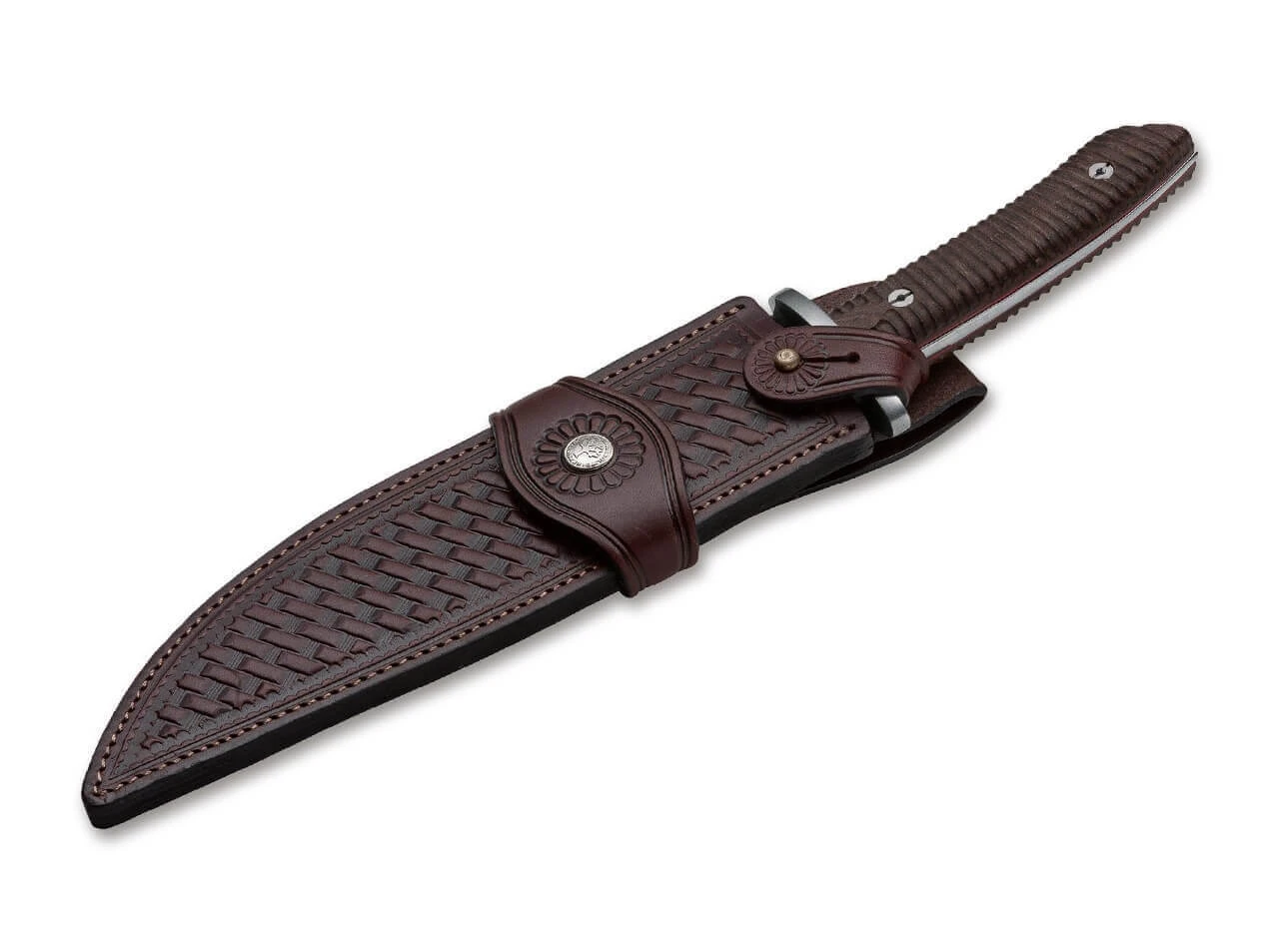 Die massive Bauweise in Kombination mit der klassischen Optik und dem hohen Gebrauchswert machen das Böker Arbolito El Gigante zu einem ausgezeichneten Begleiter für Outdoor und Jagd. Die Beschalung aus Guayacan–Ebenholz ist mit roten Fiberunterlagen versehen, was einen schönen Kontrast zur Maserung des Holzes bietet. Die rauhe und griffige Struktur erinnert an das Horn einer Oryx-Antilope. Die klassische Anmutung des Materials im Zusammenspiel mit dem überaus praxistauglichen Stonewash-Finish machen das Bowie zu einem außergewöhnlichen Messer nicht nur für den Einsatz, sondern auch für den Sammler. Die massive Klinge aus Böhler N695–Stahl läuft komplett durch den Griff und verjüngt sich zum Griffabschluss. Der sogenannte Tapered Tang verleiht dem Hirschfänger eine besondere optische Note und balanciert es optimal aus. Der ausladende und kräftige Handschutz aus gebürstetem Edelstahl verspricht hohe Arbeitssicherheit und trägt zum edlen Erscheinungsbild bei. Lieferung mit hochwertiger braunen Lederscheide.