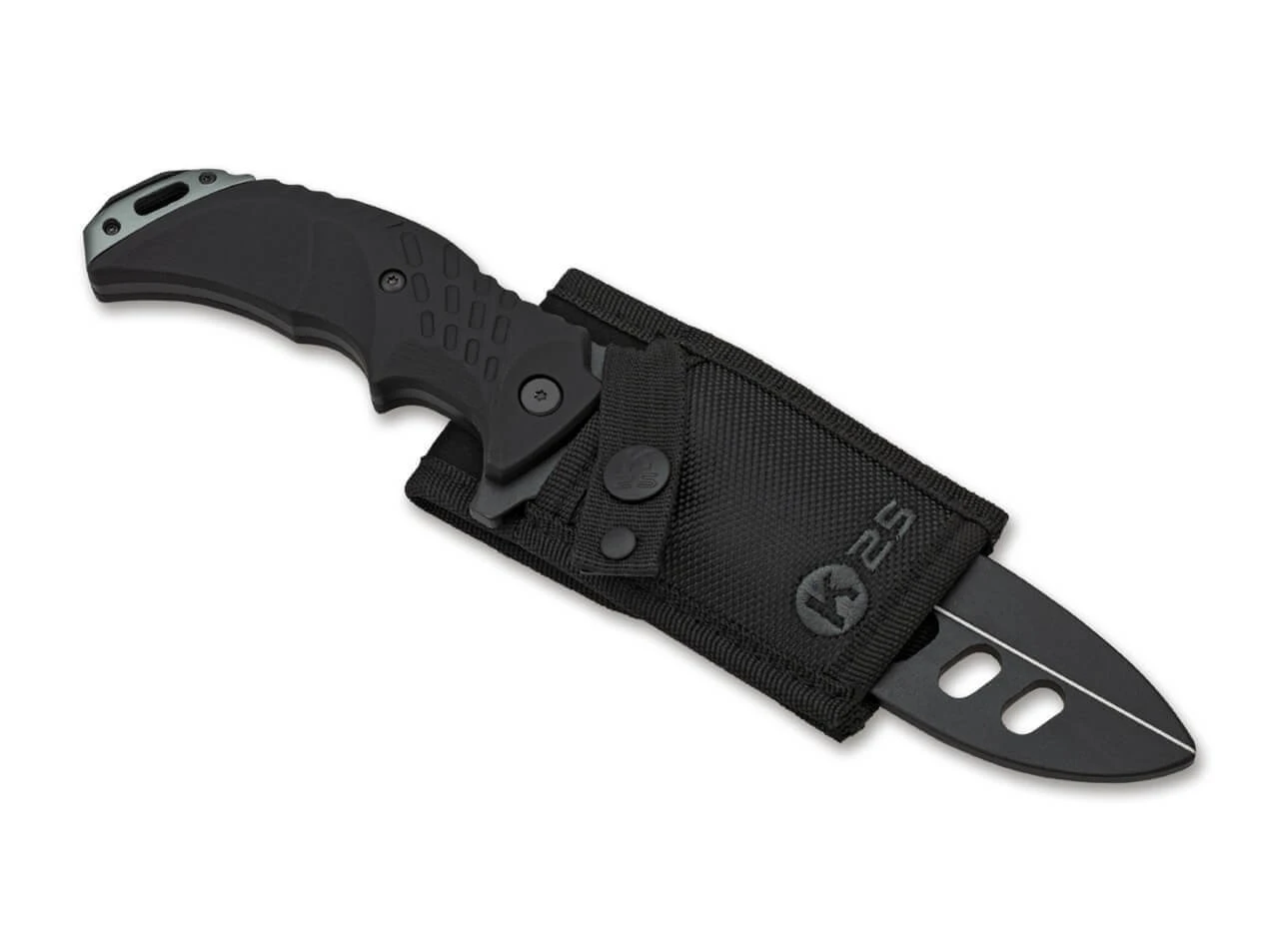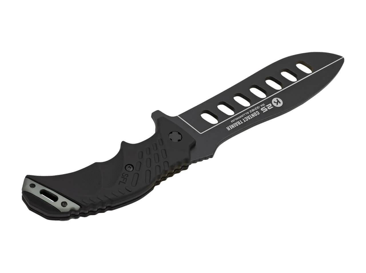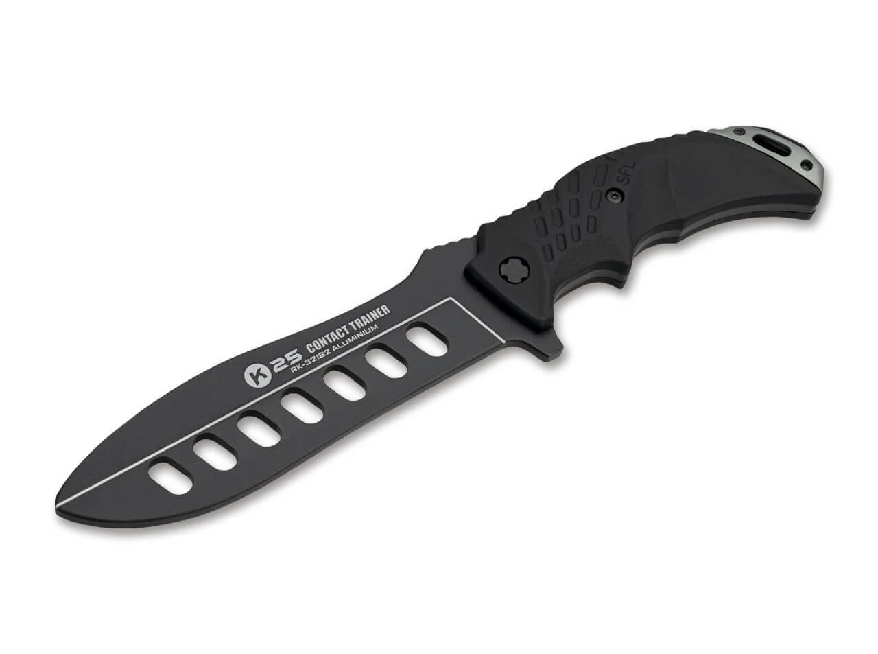 Das stumpfer Trainingsmesser von K25 wird aus schwarzem Aluminium gefertigt und ist mit einem gummierten Griff versehen. Lieferung mit praktischer Nylonscheide.
