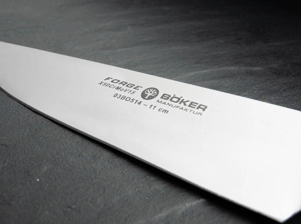 Die Kochmesser-Serie Böker Forge Wood verbindet innovative und dynamische Formgebung mit klassischer Materialauswahl in Premiumqualität. Auffallend ist die attraktive Linienführung, die die Messer deutlich von der Masse der herkömmlichen Küchenmesser abhebt, ohne zu exzentrisch zu wirken. Darüber hinaus überzeugt die Serie Böker Forge mit einem ausgesprochen attraktiven Preis-Leistungs-Verhältnis. Die aus dem Chrom–Molybdän-Vanadium Edelstahl X50CrMoV15 gefertigten Messer sind optimal ausbalanciert und liegen durch die ergonomische Griffgestaltung perfekt in der Hand. Die Griffschalen aus hochwertigem Ahornholz werden klassisch mit drei Edelstahlnieten dauerhaft und ohne Fugen mit dem vollständig durchgehendem Messererl verbunden. Die Gestaltung der Klingen samt Übergang zum Kropf erlaubt ein problemloses Nachschärfen und gewährleistet in Kombination mit der richtigen Pflege eine langfristig perfekte Funktion der Messer. Bitte reinigen Sie die Messer nur per Handwäsche und nicht in der Spülmaschine. Darüber hinaus überzeugt die Serie Böker Forge mit einem ausgesprochen attraktiven Preis-Leistungs-Verhältnis. Die Auslieferung der Messer erfolgt in einer hochwertigen Geschenkverpackung.