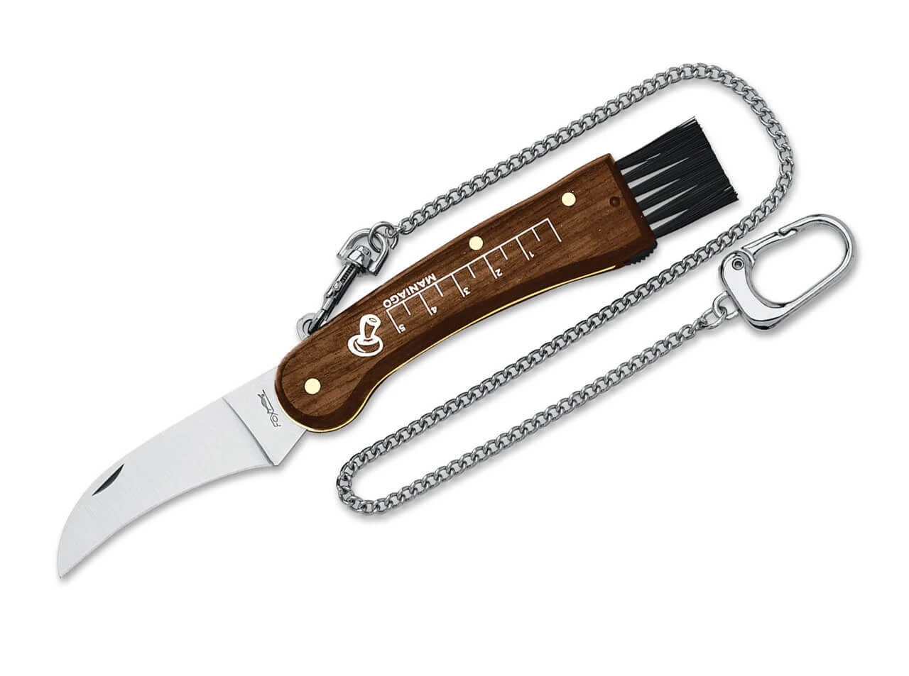 Herbstzeit ist Pilzezeit! Und mit der richtigen Ausrüstung wird das Pilzesammeln zum Kinderspiel. Dieses klassische Pilzmesser von Fox bietet neben der gekrümmten Klinge für den einfachen und sauberen Schnitt eine Bürste zum Reinigen des Pilzes von Nadeln oder Erde, und die Zentimeterskala auf der Griffschale macht das Messen leicht. Die Bürste dieses Modells ist einklappbar und besteht aus synthetischen Borsten. Die Griffschalen sind aus Palisanderholz. Die Lieferung erfolgt mit einer Kette zur Sicherung des Messers. Zusätzlich besitzt es einen Karabinerhaken.