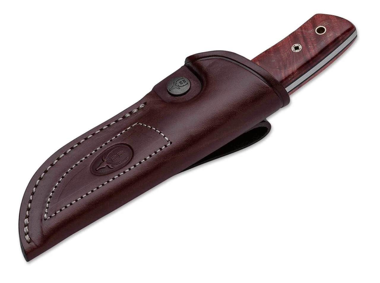 Eines der beliebtesten und vielseitigsten Modelle von Muela ist das Kodiak. Die Jubiläumsedition begeistert mit ihrer roten Beschalung aus stabilisiertem Ahorn-Wurzelholz, die von zwei besonders edlen durchbrochenen Mosaikpins gehalten wird und mit schwarzen Fiberlagen unterlegt ist. Auch der Anstoß zur Neusilberbacke ist mit schwarzer Fiber ausgelegt. Als Klingenstahl für das Kodiak Anniversary kommt erstmals bei Muela Böhler N690 zum Einsatz, was nicht nur die Attraktivität für Sammler steigert, sondern auch den praktischen Nutzwert. Mit individueller Seriennummer auf der Backe und Anniversary-Klingenlaserung. Limitiert auf 999 Exemplare weltweit. Lieferung mit Lederscheide.