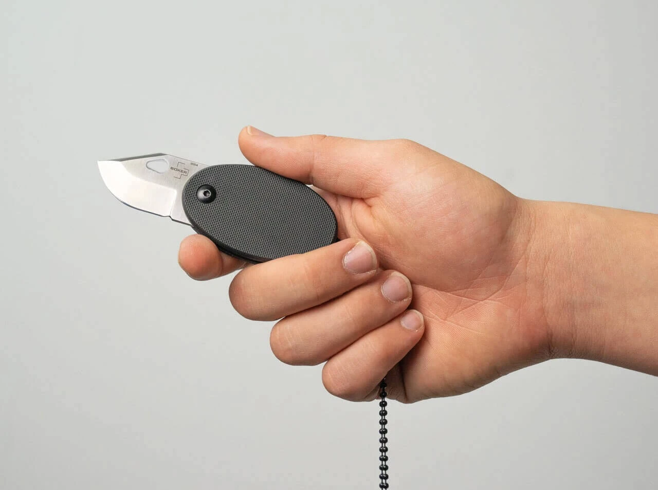 Die Frage nach der Henne und dem Ei beantwortet der für seine einfallsreichen Entwürfe bekannte Messerdesigner John Kubasek aus Massachusetts mit dem außergewöhnlichen und innovativen Böker Plus L’Egg. Das handliche Neck Knife verdankt seinen Namen der eiförmigen Konstruktion der Griffschalen aus texturiertem G10, von denen die satinierte Clippoint-Klinge aus D2 im geschlossen Zustand vollständig wie eine schützende Eierschale umschlossen wird. Der ausgeklügelte Mechanismus der sich gegeneinander verschiebenden Griffschenkel wird von einem Magneten sicher arretiert. Das leichtgewichtige Messer wird mit einer praktischen Kugelkette ausgeliefert.