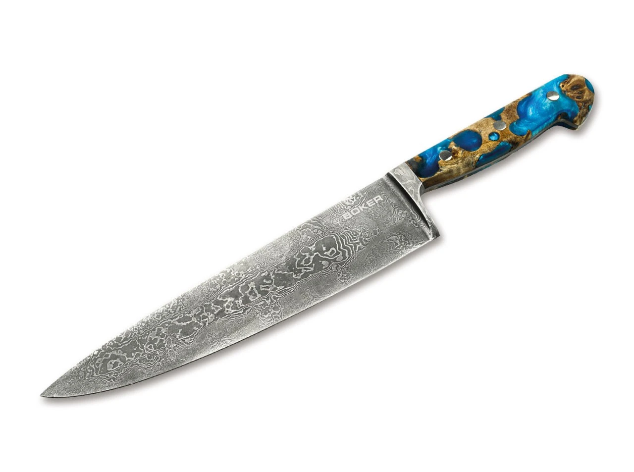 Das beeindruckende Böker Laguna Damast Chefmesser ist im wörtlichen Sinne ein Stück lebendige Geschichte, denn der 180-lagige Damast wurde von Chad Nichols aus einem massiven Teil der Welle eines alten Transmissionsrades unserer Manufaktur geschmiedet. Im nächsten Schritt wird das verschmiedete Spaltstück bei uns in Solingen in der Gesenkschmiede weiterverarbeitet. Nachdem es dort bis zur Rotglut erhitzt wurde, wird es von einem zwei Tonnen schweren Fallbär in einer massiven Form in Kontur geschlagen. Der Griff des außergewöhnlichen Kochmessers im klassischen Solinger Drei-Nieten-Design steht der Klinge optisch und funktional in Nichts nach. Der atemberaubende Tiefeneffekt erinnert an eine paradiesische Lagune und wird durch die Kombination von heimischem Pappelholz mit blauem Harz hervorgerufen. Die Auslieferung des weltweit auf 20 Stück limitierten Kochmessers erfolgt mit individueller Seriennummer in einer lederbezogenen Geschenkverpackung und mit Echtheitszertifikat. Handgefertigt in der Böker Messer-Manufaktur Solingen.
