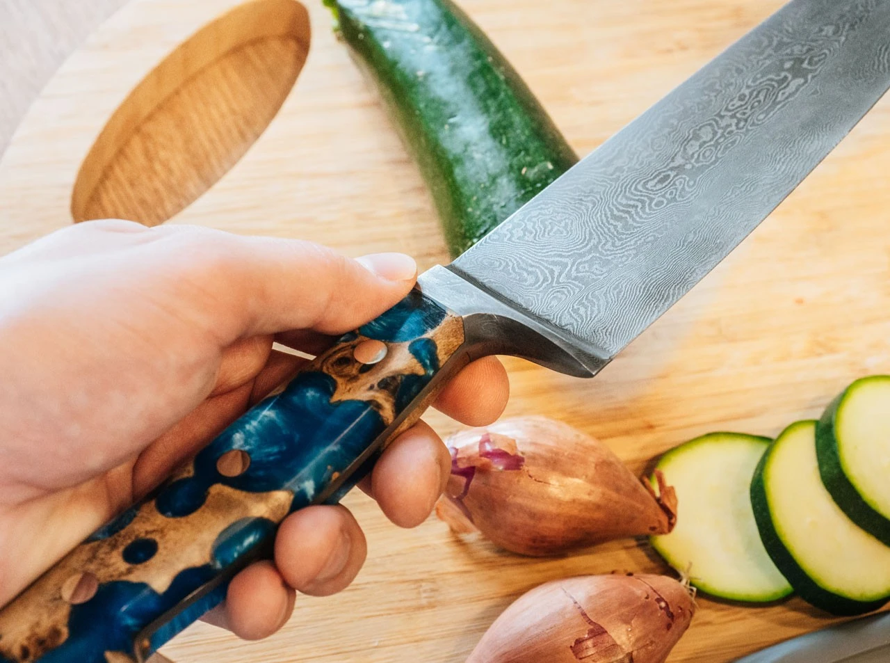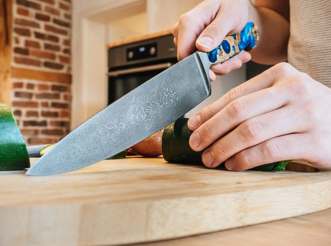 Das Chefmesser, oder auch Kochmesser, zählt zu den wichtigsten Messern in der Küche und gehört zur Grundausstattung. Es hat eine etwas breitere und längere Klinge als das Allzweckmesser. Die schlanke Spitze eignet sich ausgezeichnet dazu Zwiebeln oder kleines Gemüse zu schneiden. Dank seiner Länge kann man es aber auch hervorragend als Fleischmesser benutzen. Auch große Gemüsesorten lassen sich problemlos damit verarbeiten.
