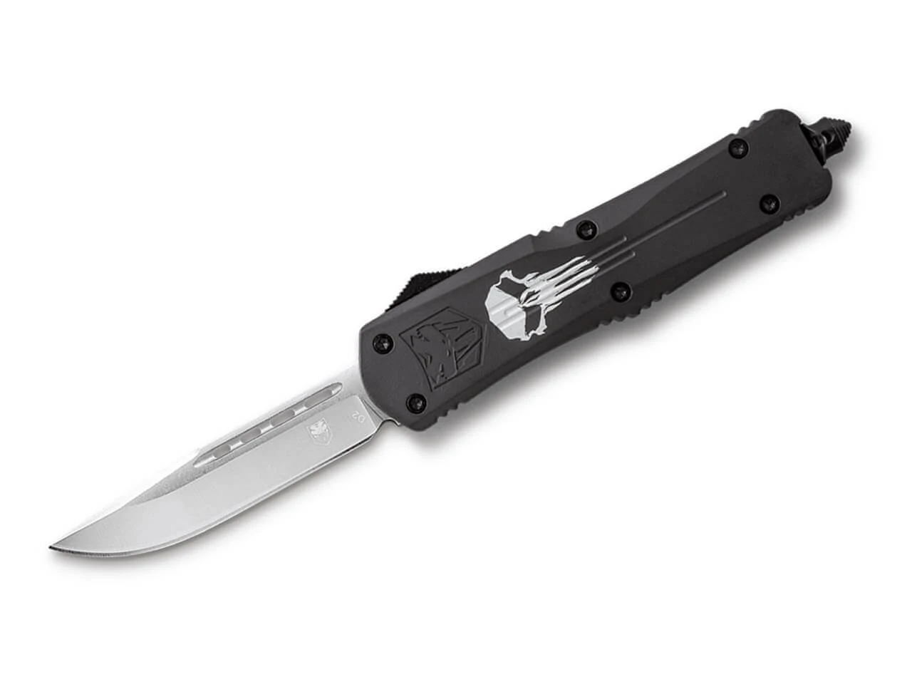 Die ausgewachsene Variante des beliebten FS-3 überzeugt mit einer soliden D2 Drop Point Klinge, die pfeilschnell per Knopfdruck aus dem vorderen Griffstück kommt und bei erneutem Betätigen wieder dort verschwindet. Das OTF Messer (Out The Front) ist mit einem schwarzen Griff aus hochfestem Aluminium versehen, der einen beängstigenden Totenkopf abbildet. Der Deep-Carry Clip ist am Glasbrecher befestigt und erlaubt eine beidseitige Tip-Up Trageweise. Lieferung mit hochwertigem Nylon Etui.