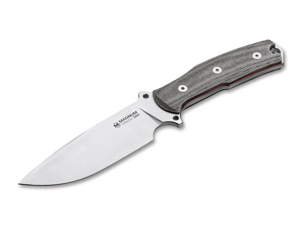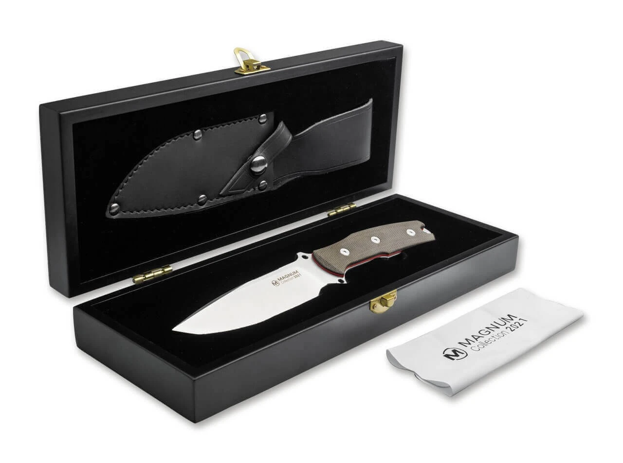 Der ergonomische Griff ist mit polierten Micarta-Schalen ausgestattet, die zusätzlich mit einer dezenten roten Fiberlage versehen sind. Deutlich auffälliger sind die drei dekorativen Griffschrauben, welche die Stärke des Outdoormessers noch einmal deutlich unterstreichen. Die opulente Fangriemenöse zur Befestigung von Lanyards rundet die Ausstattung des Messers ab. Das Magnum Collection 2021 ist limitiert auf 1.999 Stück weltweit. Die Auslieferung erfolgt mit einer hochwertigen Lederscheide in einer exklusiven Sammlerschatulle und mit Echtheitszertifikat.