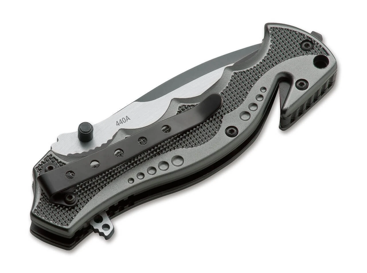 Das Magnum Hero spiegelt den Mut und die Professionalität der Spezialisten wider, die bei gefährlichen Polizeieinsätzen ihr Leben aufs Spiel setzen. Die rostfreie Klinge aus 440A ist mit einem attraktiven Two-Tone-Finish versehen und arretiert über den Linerlock. Der anthrazitfarbene Griff ist mit SWAT-Logo versehen und besteht aus leichtigewichtigem, stabilen Aluminium. Der Glasbrecher, der partielle Wellenschliff, der Gurtschneider und der federunterstütze Öffnungsmechanismus stehen für eine hohe Funktionalität. Mit Clip und Fangriemenöse.