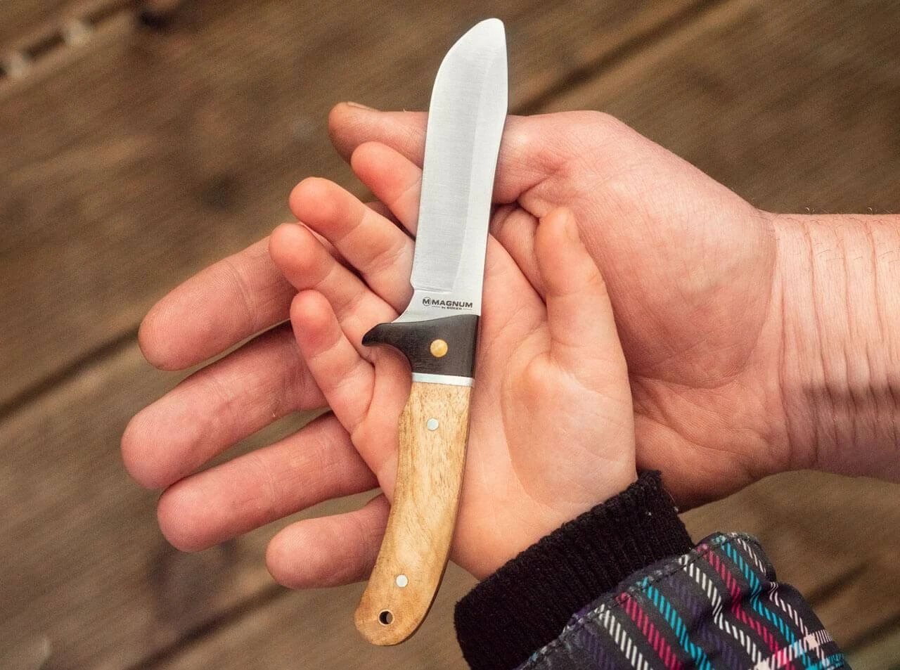 Das Magnum Kids Knife ist ein feststehendes, sicheres Kindermesser, das in Anlehnung an das Erfolgsmodell Elk Hunter entstanden ist. Das explizit für Kinderhände konzipierte Messer ist jedoch deutlich kleiner und verfügt aus Sicherheitsgründen über eine abgerundete Spitze. Die dadurch auch für junge Abenteurer geeignete Klinge wird aus 440A gefertigt und ist mit einem stark ausgeprägten Handschutz versehen, der ein Abrutschen der Hand auf die Klinge verhindert. Aber Achtung, die Schneide ist selbstverständlich trotzdem scharf genug zum Schnitzen und Schneiden. Der Griff des Fahrtenmessers besteht aus Palisander- und Wurzelholz. Lieferung mit praktischer Lederscheide, die durch einen Druckknopf gesichert wird und am Gürtel befestigt werden kann. Das Kindermesser macht die Ausrüstung jedes Pfadfinders und Nachwuchs-Schnitzers komplett.