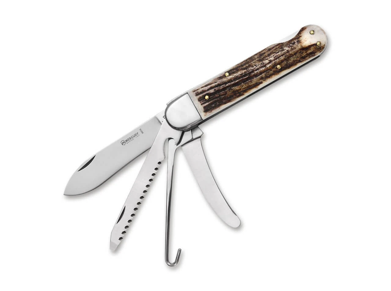 Das klassische Taschenmesser ist mit einer Klinge aus Z50CD15 ausgestattet, die per Nagelhau öffnet und mit dem sicheren Backlock verriegelt wird. Zusätzlich verfügt das Messer über eine Aufbruchklinge, einen Haken und eine Säge. Die Edelstahlbacken bilden einen gelungenen Kontrast zu den Messingnieten in den Griffschalen aus edlem Hirschhorn.