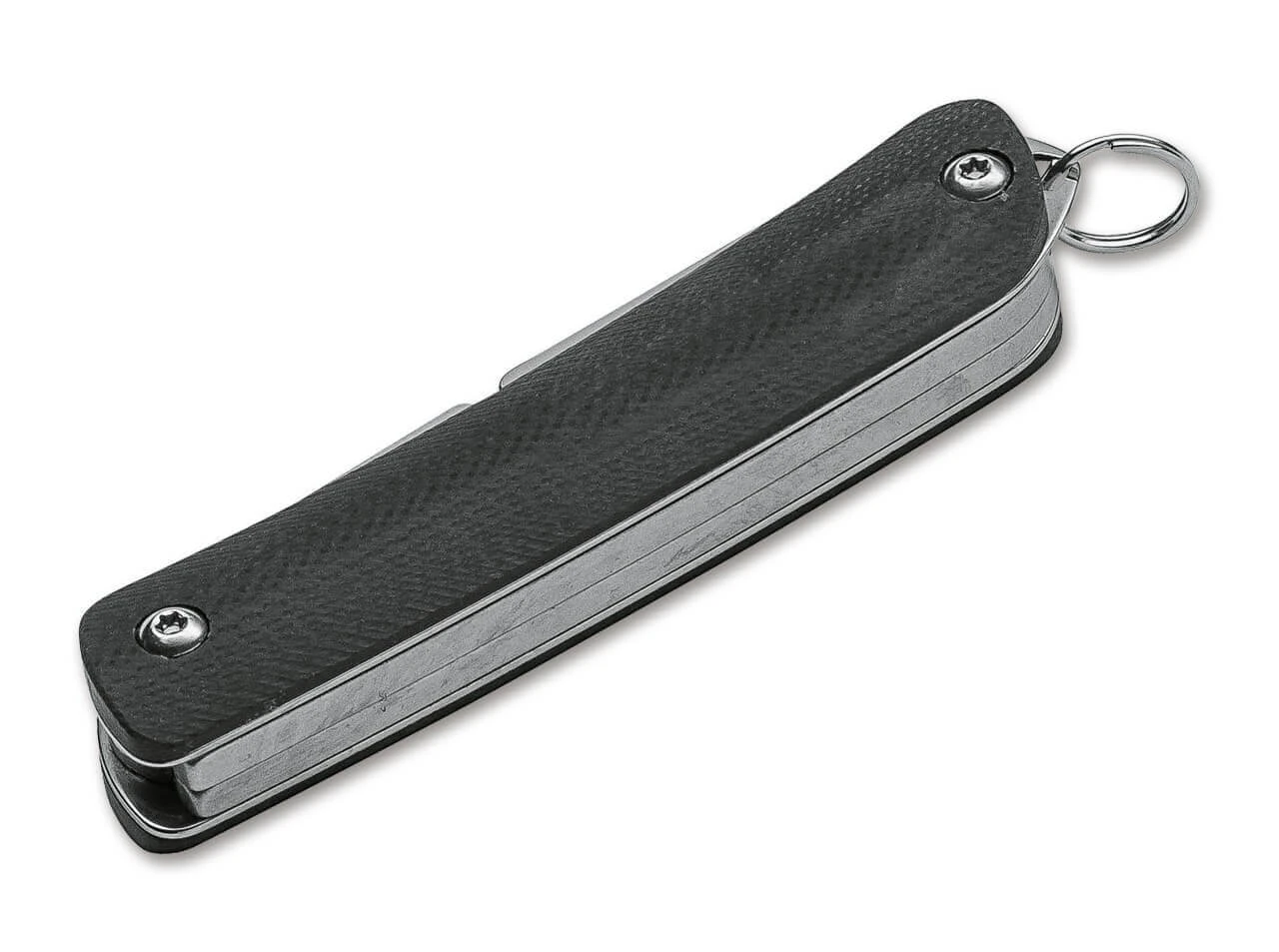 Mit 5,2 Zentimetern Klingenlänge ist das Böker Plus Tech Tool Mini deutlich vielseitiger, alltagstauglicher und effektiver als viele bekannte Schlüsselbundmesser. Es liegt jedoch immer noch absolut innerhalb des Größenbereichs, der auch für den Schlüsselbund prädestiniert ist. Die gleichen hochwertigen Ausstattungsmerkmale wie beim großen Bruder zeichnen auch das Tech Tool Mini aus: Polierte und hohlgeschliffene Klinge aus Sandvik 12C27, konturierte Griffschalen aus schwarzem G10 und ein verschraubter Griff. Eine feste Öse samt Schlüsselring gehört beim Tech Tool Mini zum Standard. Zusätzlich ist es mit einer Schere ausgestattet.
