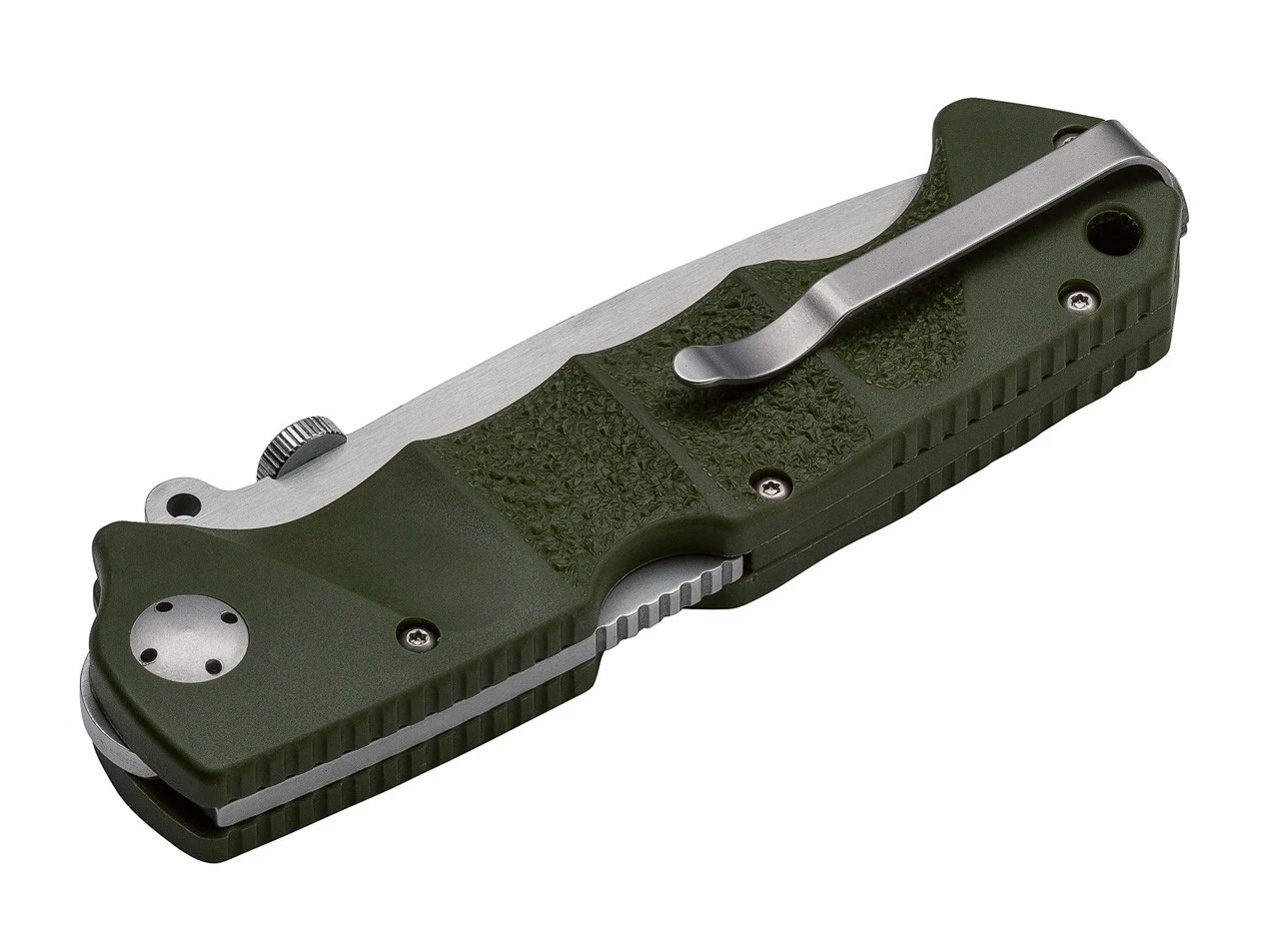 Die Vielseitigkeit des RBB Taschenmessers ist durch die Fülle an erhältlichen Varianten bereits umfassend dokumentiert. Die neue Bushcraft-Version überzeugt mit einem modifizierten Scandi-Schliff, der in Outdoorbelangen für viele die erste Wahl ist. Die abnehmbare Daumenscheibe ist so konzipiert, dass bei Demontage keine störende Lücke im Klingenrücken verbleibt. Der Klingenrückenbereich vor der Daumenscheibe ist bewusst scharfkantiger gehalten, um die mühelose Verwendung eines Feuerstarters zu gewährleisten. Der sonst RBB-übliche Glasbrecher wurde beim RBB Bushcraft gegen eine kleine Hammerfläche ausgetauscht. Grüne Zytelbeschalung, Klingenstahl 440C.