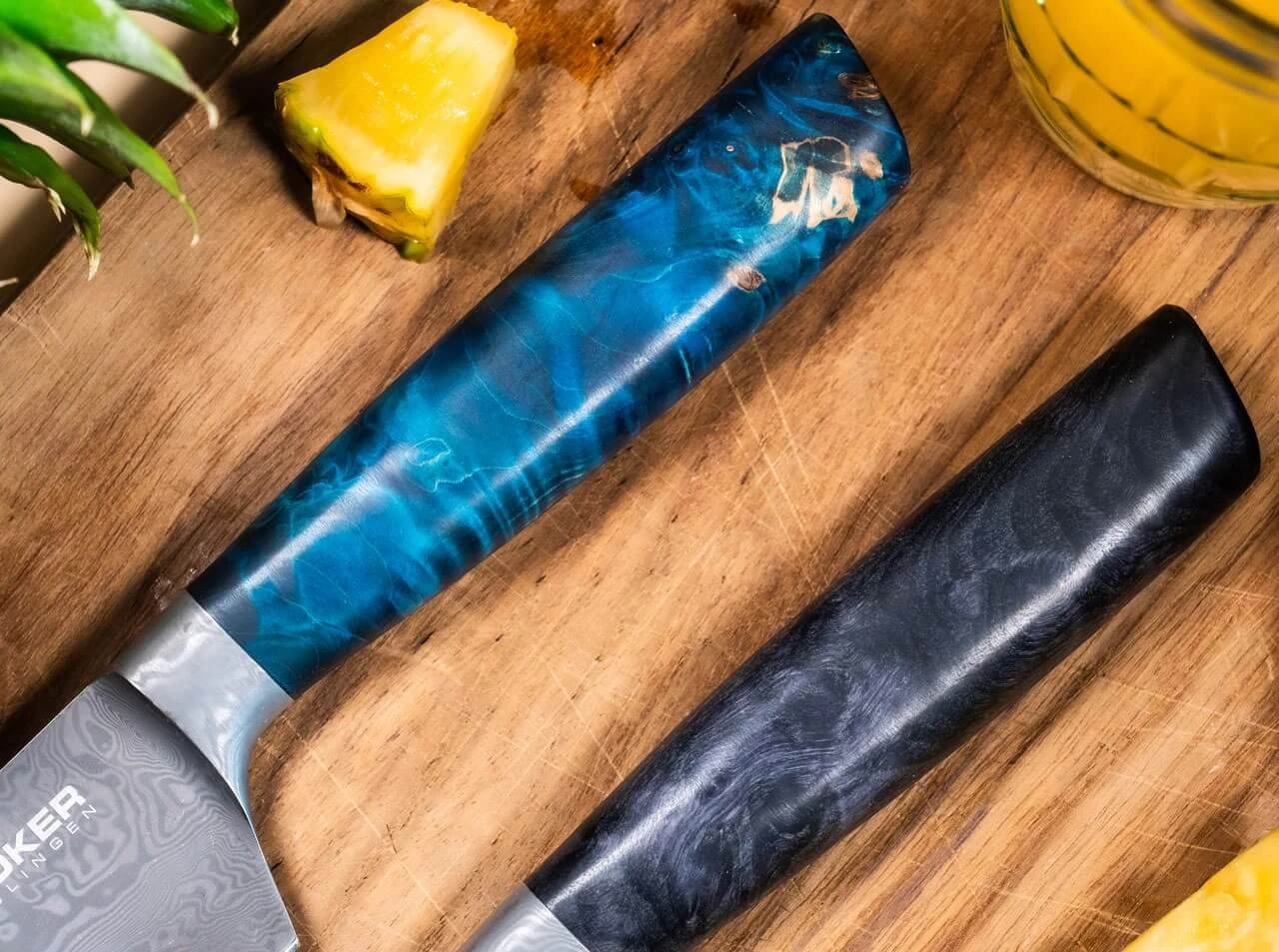 Der Griff des Böker Santorini Damast Chefmessers steht der Klinge optisch und funktional in Nichts nach. Der atemberaubende Tiefeneffekt erinnert an die berühmten dunklen Strände der Ägäis und wird durch die Stabilisation von zertifiziert importiertem Amboinaholz mit schwarzem Harz hervorgerufen. Die Auslieferung des weltweit auf nur 20 Stück limitierten Kochmessers erfolgt mit individueller Seriennummer in einer lederbezogenen Geschenkverpackung und mit Echtheitszertifikat. Handgefertigt in der Böker Messer-Manufaktur Solingen.