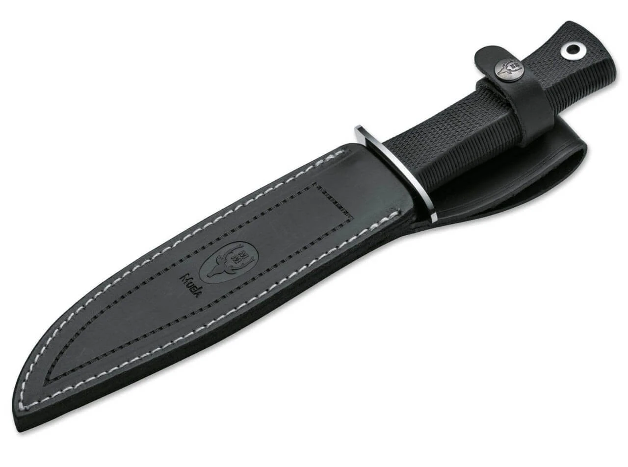 Die neue Jagdmesserserie vom Muela besitzt als übereinstimmendes Merkmal äußerst rutschfeste Griffe aus plastischem Elastomer, das sich seit Jahren großer Beliebtheit bei allen Messernutzern erfreut, denen die Funktionalität des Messers das wichtigste Kriterium ist. Nicht nur bei Nässe, sondern auch bei großer Kälte oder mit Handschuhen greift sich plastisches Elastomer wesentlich sicherer und bietet erheblich mehr Grip als klassische Griffe aus Naturmaterialien. Zudem ist natürlich auch die Resistenz gegen Nässe wesentlich höher. Ein Edelstahl-Parierelement schließt den Griff zur Klinge hin ab. Lieferung mit schwarzer Lederscheide. Ausgewachsenes Camp- und Outdoormesser für alles, was in der freien Natur anfällt. Klingenstahl 4116. Griff aus plastischem Elastomer, Edelstahl-Parierelement.