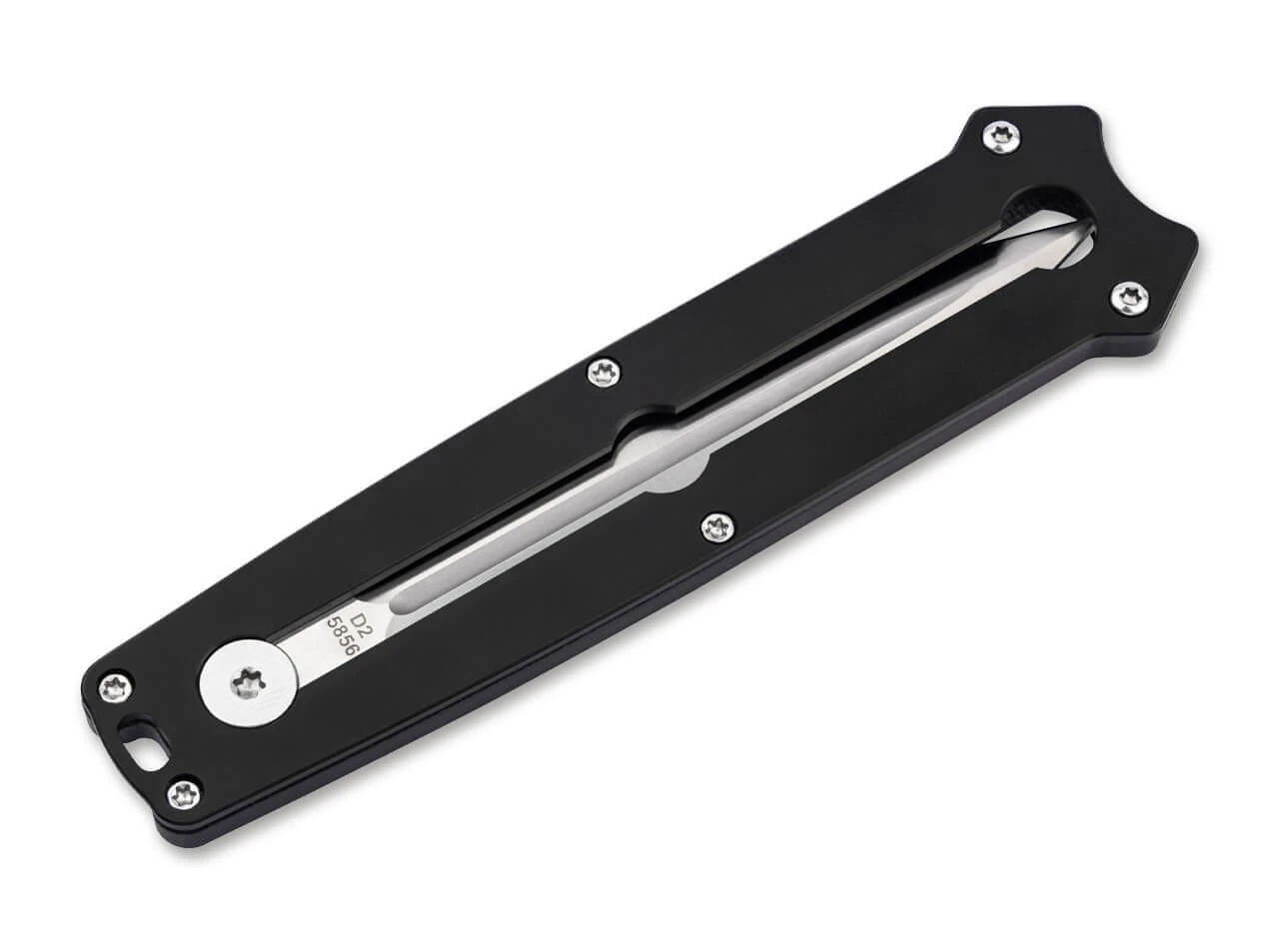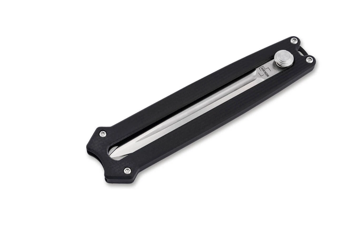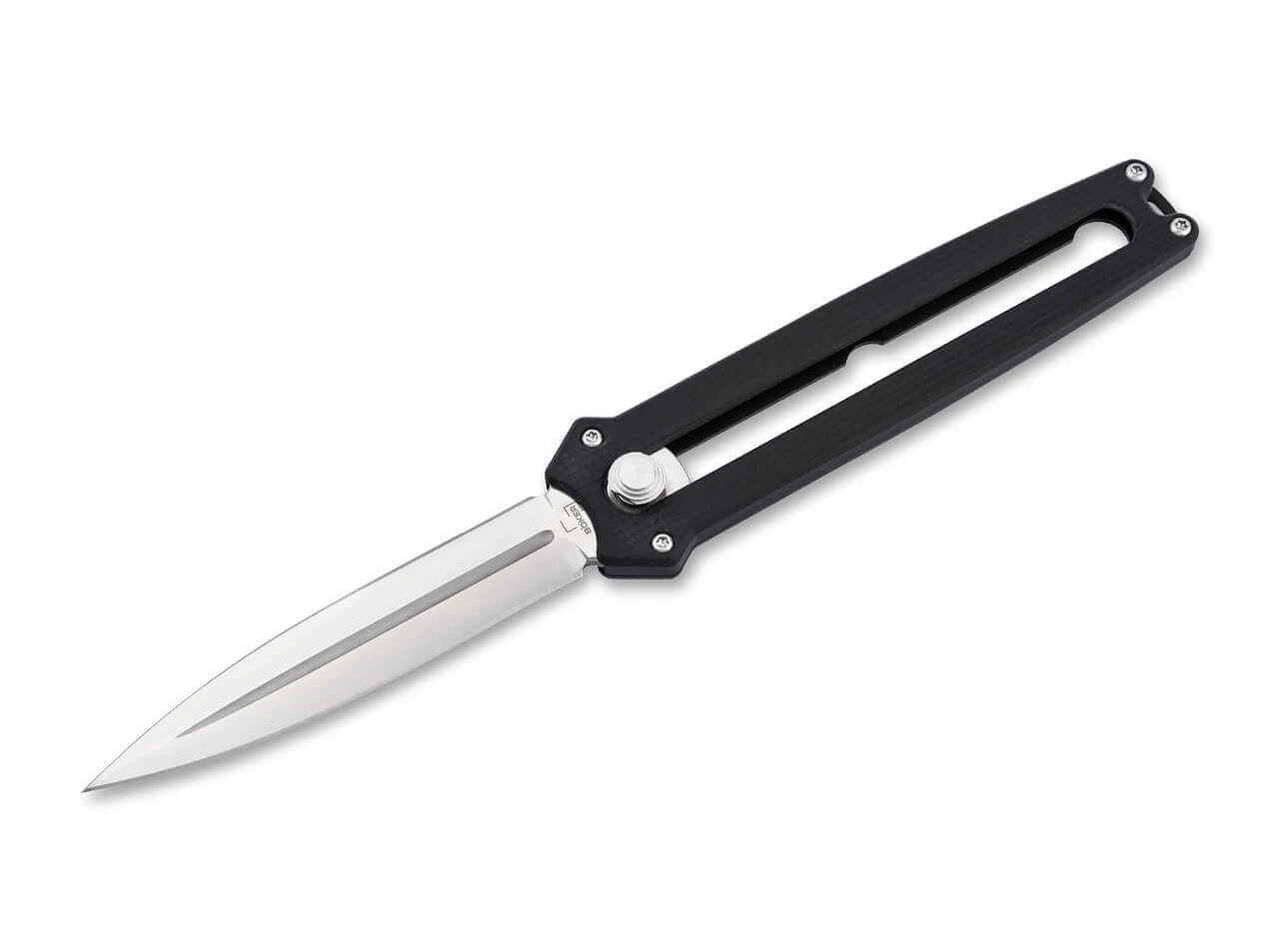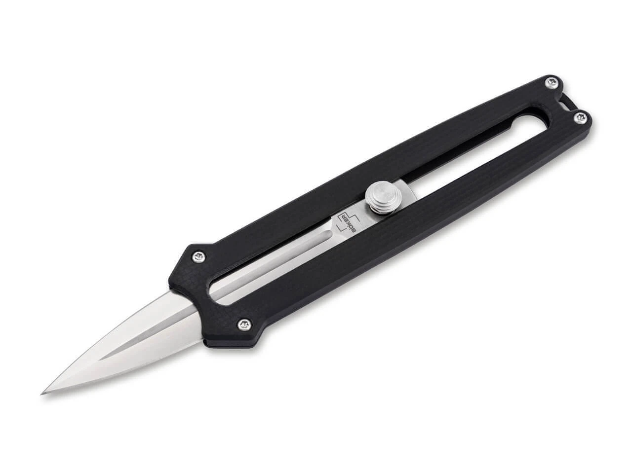 Das innovative Böker Plus Slike ist ein leichtgewichtiger Dolch mit beidseitig geschliffener Klinge aus D2, die frontal aus dem Griff geschoben wird. Vergleichbar mit dem Mechanismus der weit verbreiteten Teppichmesser wird die Verriegelung dafür per Knopfdruck gelöst und die satinierte Klinge dann manuell nach oben oder unten bewegt. Eine Rastung auf halber Strecke erhöht die Arbeitssicherheit zusätzlich. Sie ist mit einem modernen Flachschliff und einer ausgeprägten Hohlkehle versehen. Die CNC-gefräste Griffschale aus schwarzem G10 liegt trotz der geringen Größe des Taschenmessers angenehm in der Hand. Mit Fangriemenöse, großzügig dimensioniertem Deep-Carry-Clip (Tip-down).