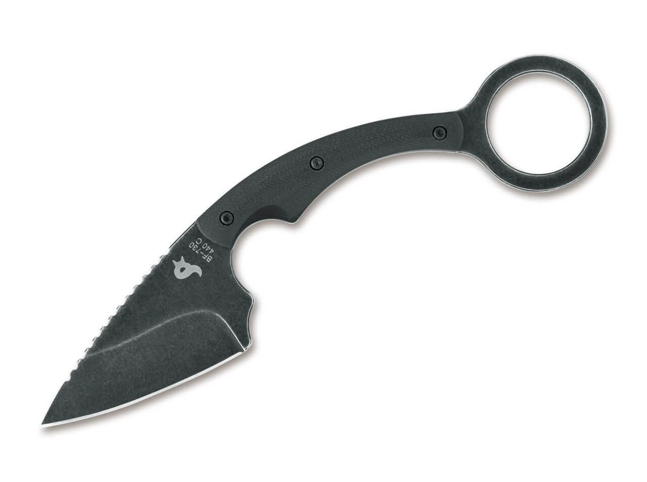 Als schlankes Neck Knife oder als kompaktes Gürtelmesser ist das BlackFox Specwarcom durch seine absolut alltagstaugliche Klingenform ein überaus nützlicher Begleiter. Und mit Sicherheit wird es auch bei der Verarbeitung von Fisch und Flugwild gute Dienste leisten. Der Einsatzbereich ist aber deutlich weiter gefasst. Wer ein griffsicheres, nicht zu großes und leichtes Fixed Blade mit origineller Optik sucht, ist mit dem Specwarcom bestens beraten. Die aufgeschraubten Griffschalen aus schwarzem G10 sorgen für mehr Volumen der schlanken Konstruktion und harmonieren wunderbar mit der rostfreien 440C-Klinge im schwarzen Acidwash-Finish. Lieferung mit Kydexscheide.