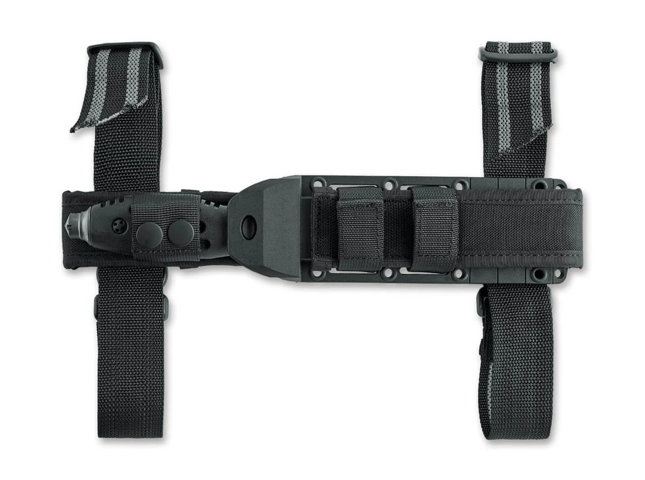 Die FKMD Sputnik Serie glänzt vor allem mit besonders hohem Gebrauchswert und einer extrem sicheren Handlage. Durch das schwarze TPR Griffmaterial ist das Sputnik 10 auch bei Nässe oder Kälte sehr komfortabel und sicher zu handhaben, wozu die zahlreichen Mulden und Rillen ihren Teil beitragen. Das kleine integrierte Parierelement trägt ebenso eine Öse wie der Glasbrecher im Griffende, wodurch sich das feststehende Messer zum Beispiel auch an einem Stock festbinden lässt. Die satinierte Klinge aus N690 ist mit ihrer außergewöhnlichen Stärke von 5mm optimal dimensioniert, um Schneidpotential und Stabilität zu vereinen. Die Fehlschärfe der Drop-Point Klinge unterstreicht den taktischen Charakter des Einsatzmessers. Die äußerst funktionale symmetrische Scheide ist aus GFK gefertigt und sitzt in einem Molle-kompatiblen Nylonhalter mit Gürtelschlaufe und abnehmbaren Beingurten.