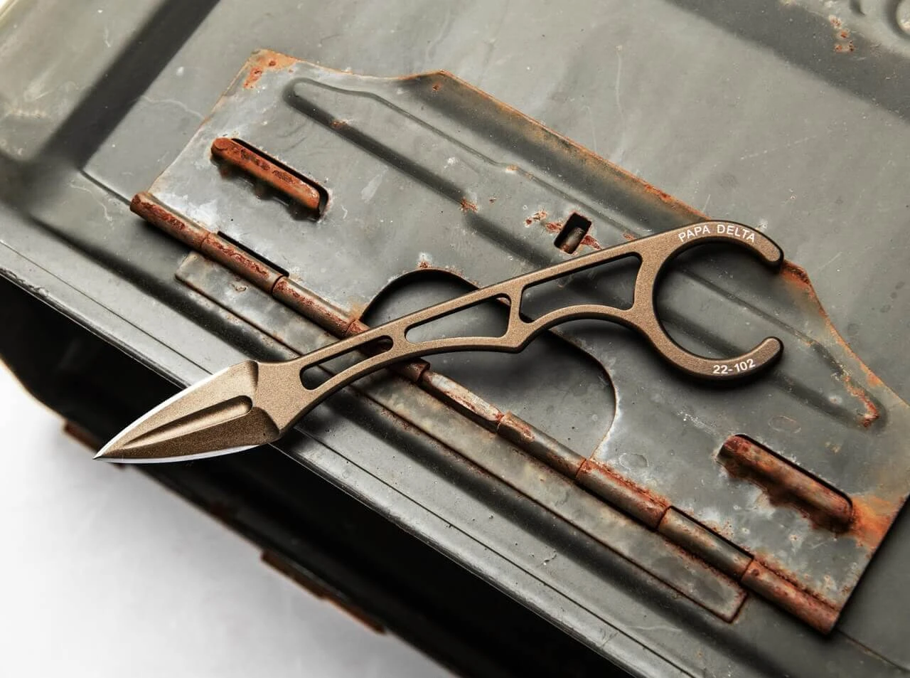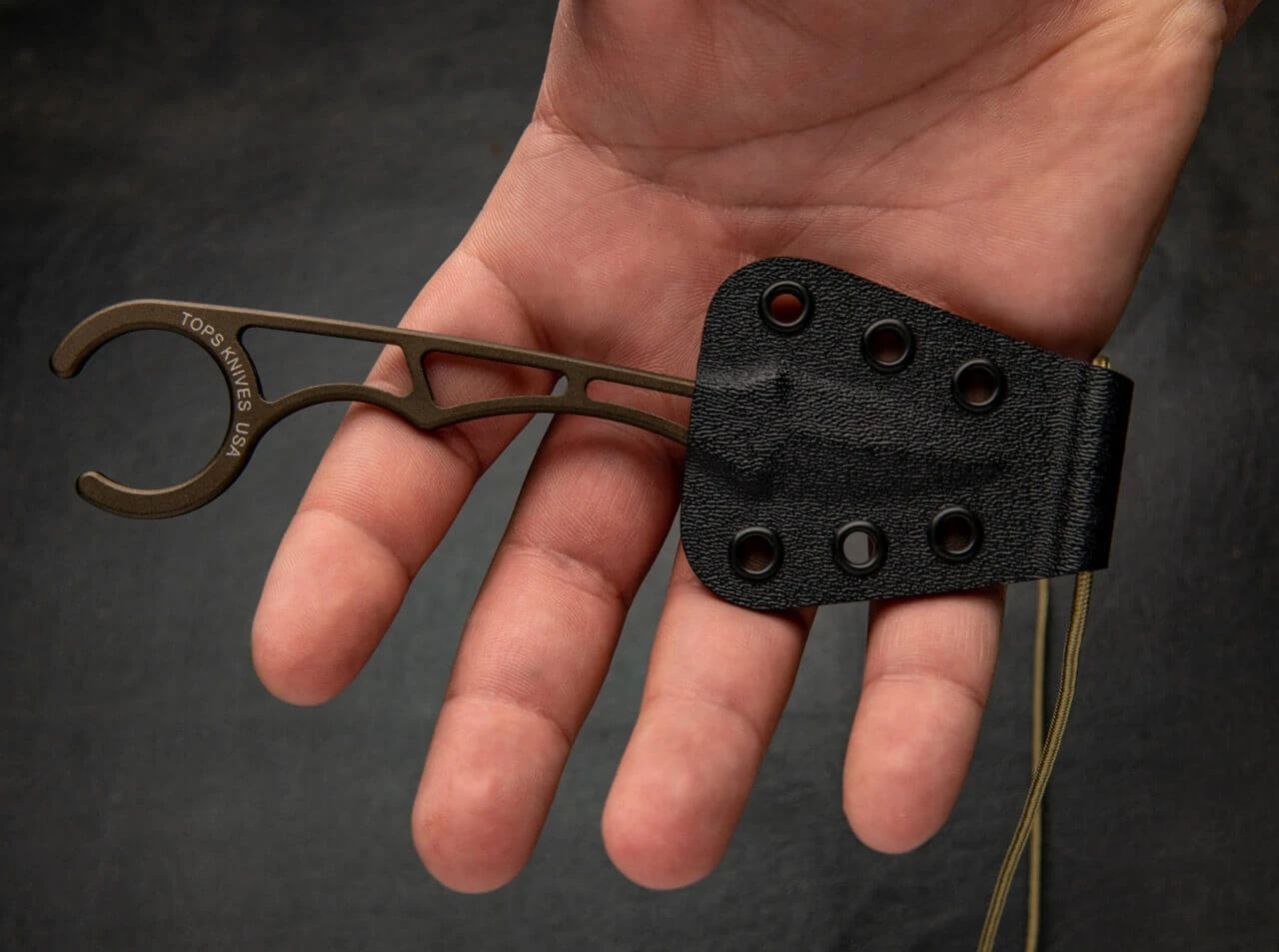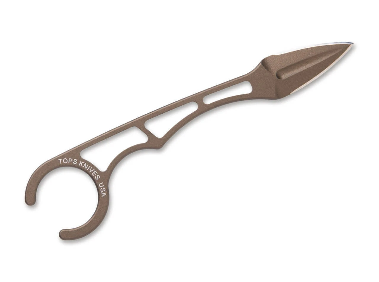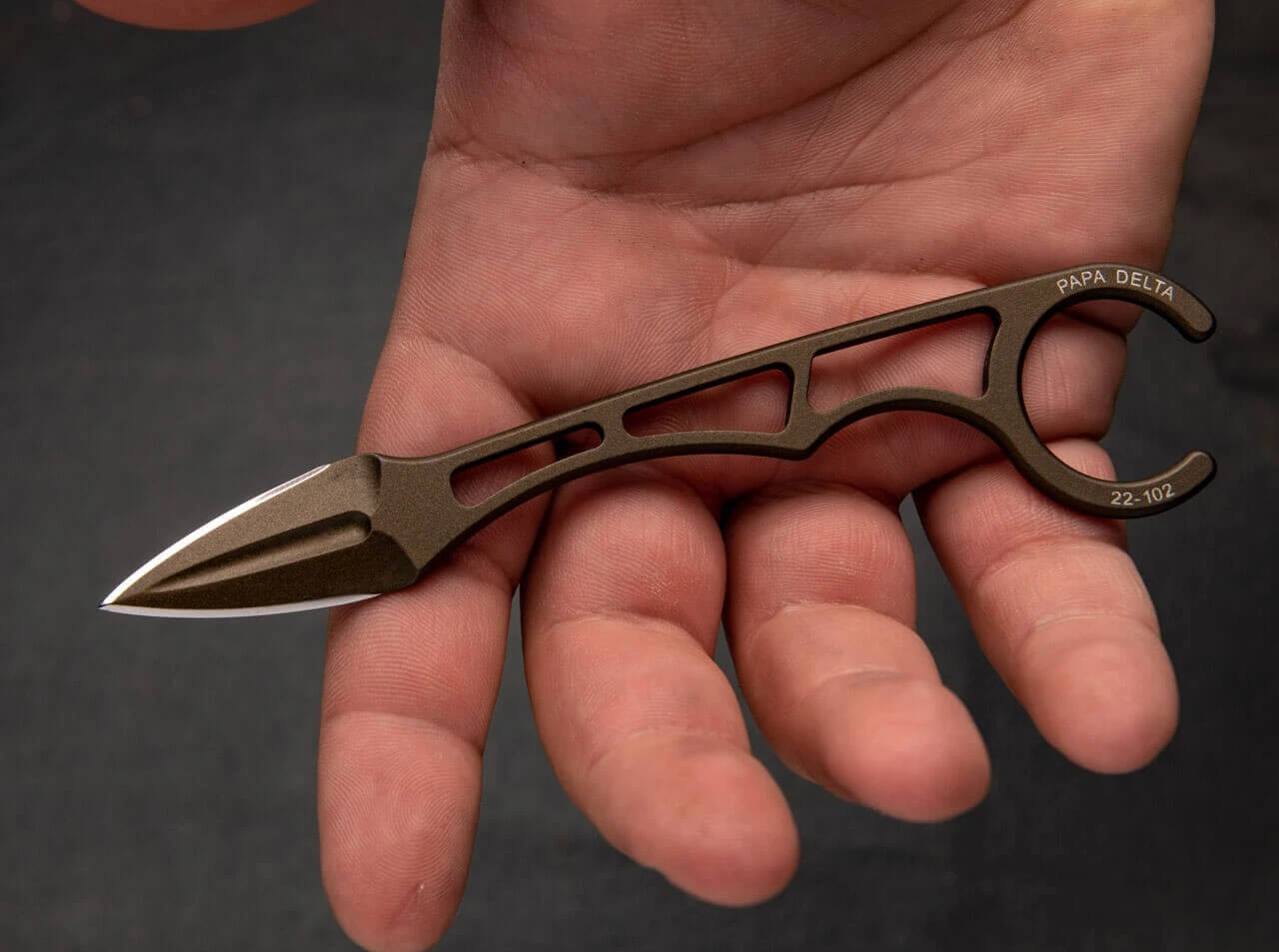 Das TOPS Papa Delta wurde von Leo Espinoza in Zusammenarbeit mit einem pensionierten Polizei- und Geheimdienstmitarbeiter entwickelt. Als taktisches Neck Knife kommt es vor allem auf eine diskrete Trageweise an. Aus diesem Grund ist es dünn, skelettiert und in jeder Hinsicht unauffällig. Das „unvollständige“ Fingerloch ist absichtlich nicht verschlossen, damit das Messer leichter losgelassen werden kann als bei einem normalen Karambit mit geschlossenem Ring. Die beidseitig abgezogene Klinge aus 1095 ist von einem Bronze Cerakote-Finish überzogen und verleiht dem feststehenden Messer eine besondere Anmutung. Dank der mitgelieferten Kydex Scheide lässt sich das Papa Delta ideal um den Hals tragen.