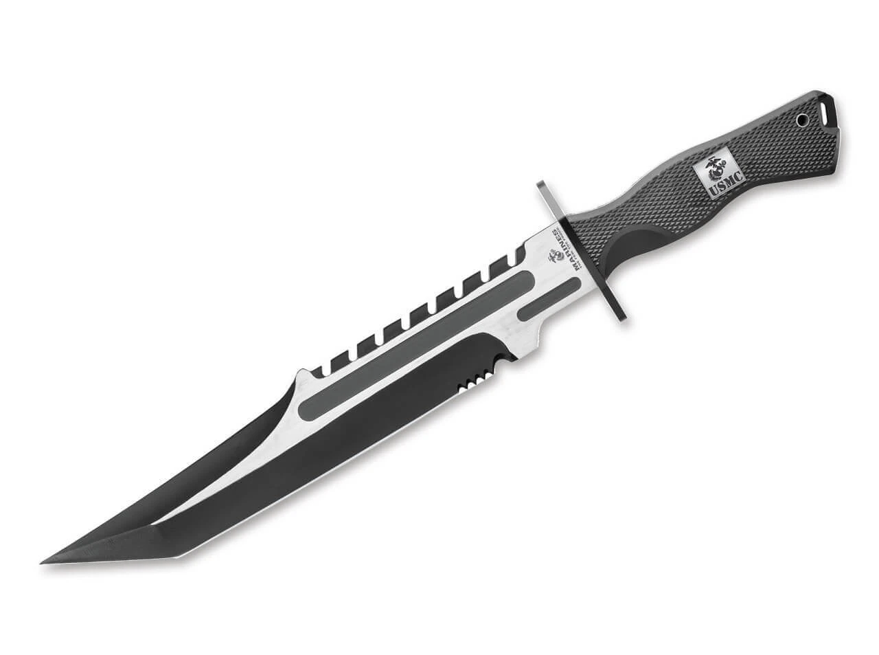 Das USMC Operation Mako Knife erlegt wie der namensgebende Mako-Hai seine Schneidarbeiten leise und mit höchster Effizienz. Die Vollerl–Tanto-Klinge aus rostfreiem Stahl ist mit einem Two-Tone Finish sowie einem markanten Sägerücken versehen. Der texturierte TPU Griff ist der mikroskopischen Hautstruktur des Hais nachempfunden und bietet sicheren Halt. Zur Erhöhung des Schutzes verhindert das Parierelement ein Abrutschen der Hand. Lieferung mit hochwertiger Nylon Scheide.