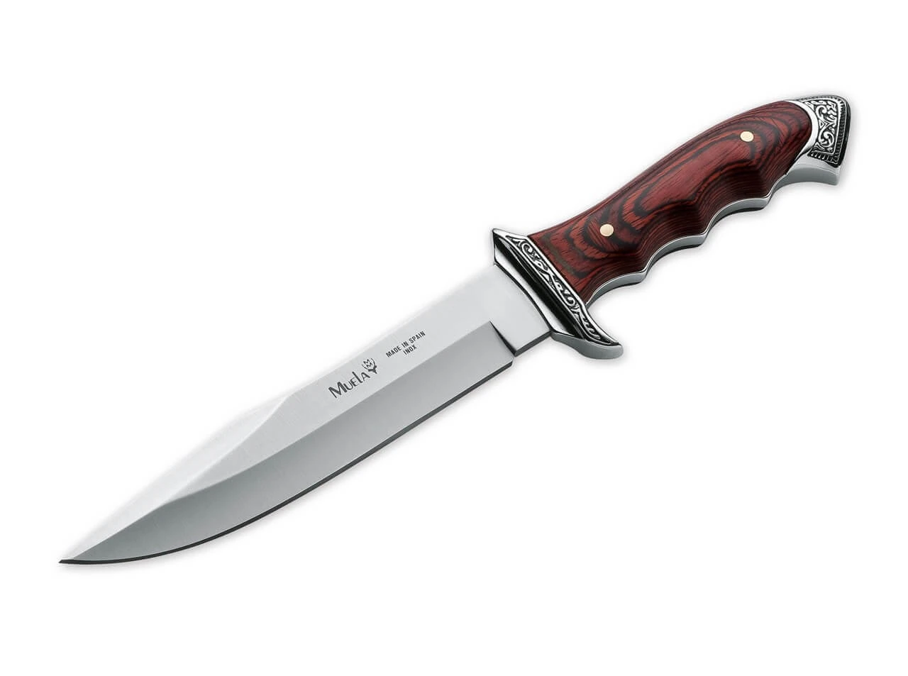 Das Muela Venecia ist ein kunstvoll verziertes Jagdmesser mit klassischer Anmutung. Der Knauf und das Parierelement sind vernickelt und mit feinen dekorativen Ornamenten versehen. Die Klinge wird aus rostfreiem I-42 Chromstahl gefertigt. Als Griffmaterial kommt dunkles Pakkaholz zum Einsatz. Lieferung mit praktischer Kunstlederscheide.