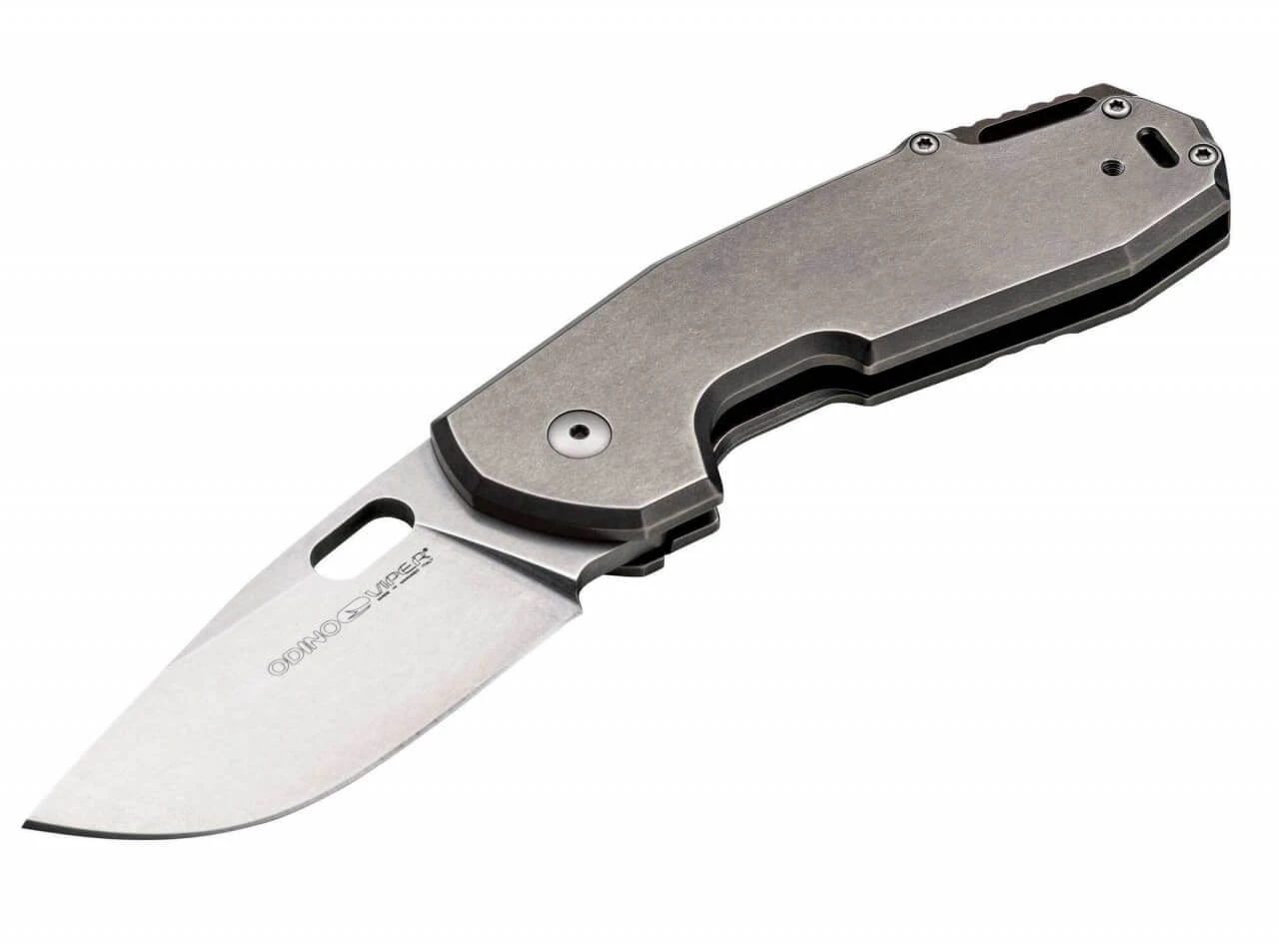Odino als Name verweist auf Odin, den höchsten der nordischen Götter, und dadurch auch auf den Ursprung des Designs, das von Jesper Voxnæs aus Dänemark stammt, dessen Handschrift hier auch leicht zu erkennen ist. Die breite, fast komplett flachgeschliffene Klinge vereint Stabilität und Nutzwert, und der Griff des Titan-Framelocks liegt ausgezeichnet in der Hand. Die tiefe Zeigefingermulde bietet ein hohes Maß an Griffsicherheit. Bei der Jagd, Outdoor, im Alltag oder beim Vesper ist das Odino für jede Aufgabe zu haben. Die markante Fangriemenöse, die in den Titan-Spacer integriert ist, und der umsetzbare Clip vervollständigen die gehobene Ausstattung. Klingenstahl N690. Griff komplett aus Titan, Klinge und Griff mit einem feinen Stonewash-Finish.